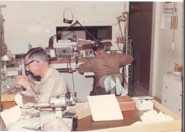 Watch makers PT Clark and H.D. "Bo" Atchison hard at work in the late 1960s